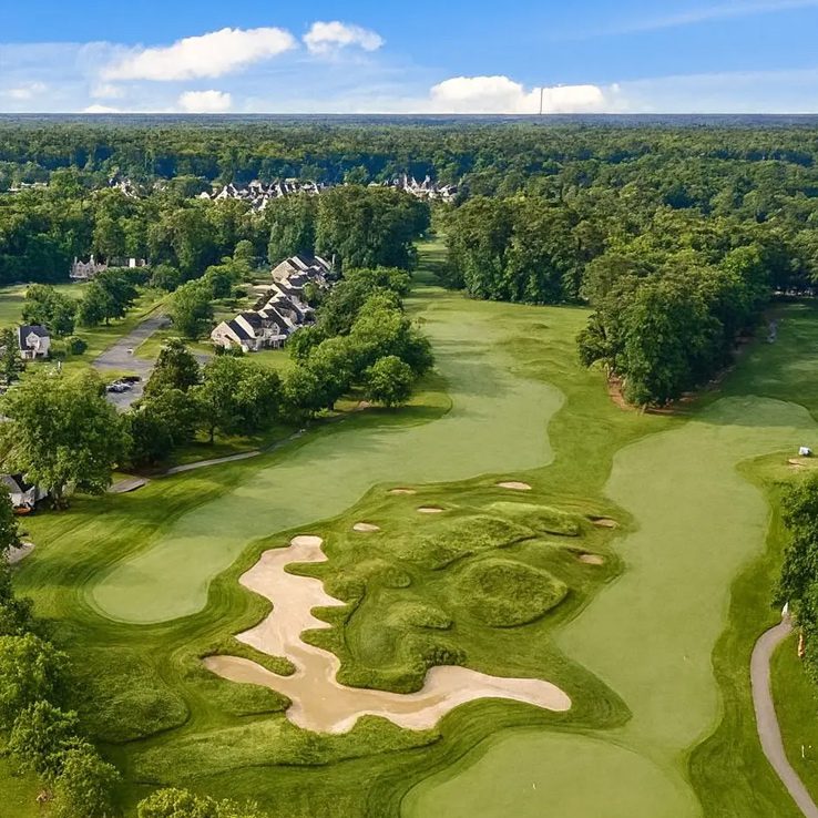 A friendly warm-up on the par-35 front nine, modeled after the links style found in Scotland, is followed by a sterner test of majestic tree-lined fairways and natural marshes found on the homeward nine. Make no mistake, the front nine is not lacking in drama with holes like the downhill par-3 fourth hole, playing its entire length over water at 222 yards from the back tees, and the 384-yard, par-4 seventh, a slight dogleg right with water in play on both the drive and second shots. River Run’s contrasting back nine rolls through wooded terrain and the signature hole can be found at the 13th, this par-4 requires a precise shot off the tee to leave you with a lofted iron approach shot over marshland to a shallow green that is guarded in the front and on two sides by marsh and water.